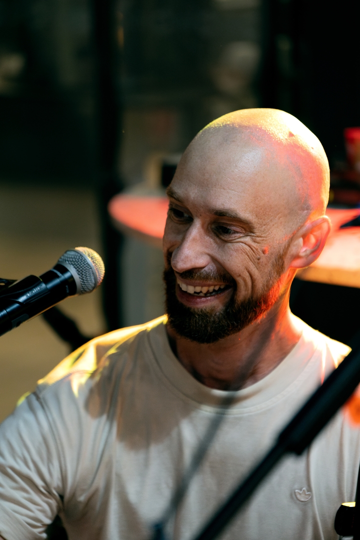 Chauve et barbu.