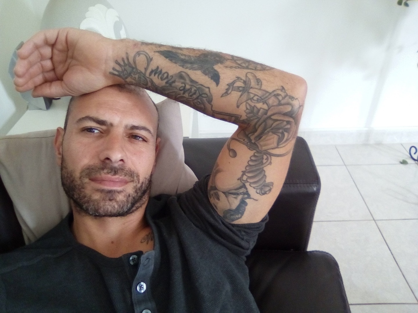 Tatoué bras gauche, cuisse droite, cicatrice arcade et front