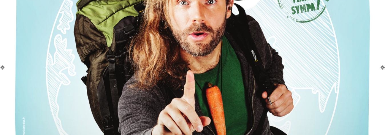 J: Hahaha ! Très bonne question ! Alors tout d'abord: je fais une insomnie. Ensuite j'essaye de récupérer à coup de siestes mais je rate. A 18h00, deux heures exactement avant le début du show, j'avale 500 grammes de pâtes pour avoir la pêche sur scène... Sauf que ça me donne envie de dormir mais comme j'ai plus que deux heures devant moi y a pas moyen. Je prépare mes affaires pour aller au théâtre. Je vérifie que j'ai bien tout trois fois parce qu'avec le manque de sommeil j'ai pas la mémoire toute fraîche ! Je fais un aller-retour au magasin bio pour acheter une carotte et me confectionner un collier (qui est l'un des deux attributs de mon personnage, avec le sac-à-dos). Je relis mon texte dans le métro. J'arrive au théâtre : je distribue des flyers dans les bars d'à côté... on sait jamais : peut-être certains n'ont-ils pas encore prévu leur soirée ? Puis je vais me changer. Je bois. Je vais aux toilettes. Je bois. Je vais aux toilettes. Je bois. Etc. (je précise au passage que c’est de l’eau que je bois). Je m'échauffe. La voix, le corps. Je fais des exercices de relaxation derrière les rideaux... la lumière s'allume. J'entre sur scène, et ça y est: je suis chez moi. Plus de stress, plus de fatigue, rien. Quand je sors une heure plus tard je suis bourré d'énergie ! C'est bizarre. Mais j'aime ça ! Quelle aventure !