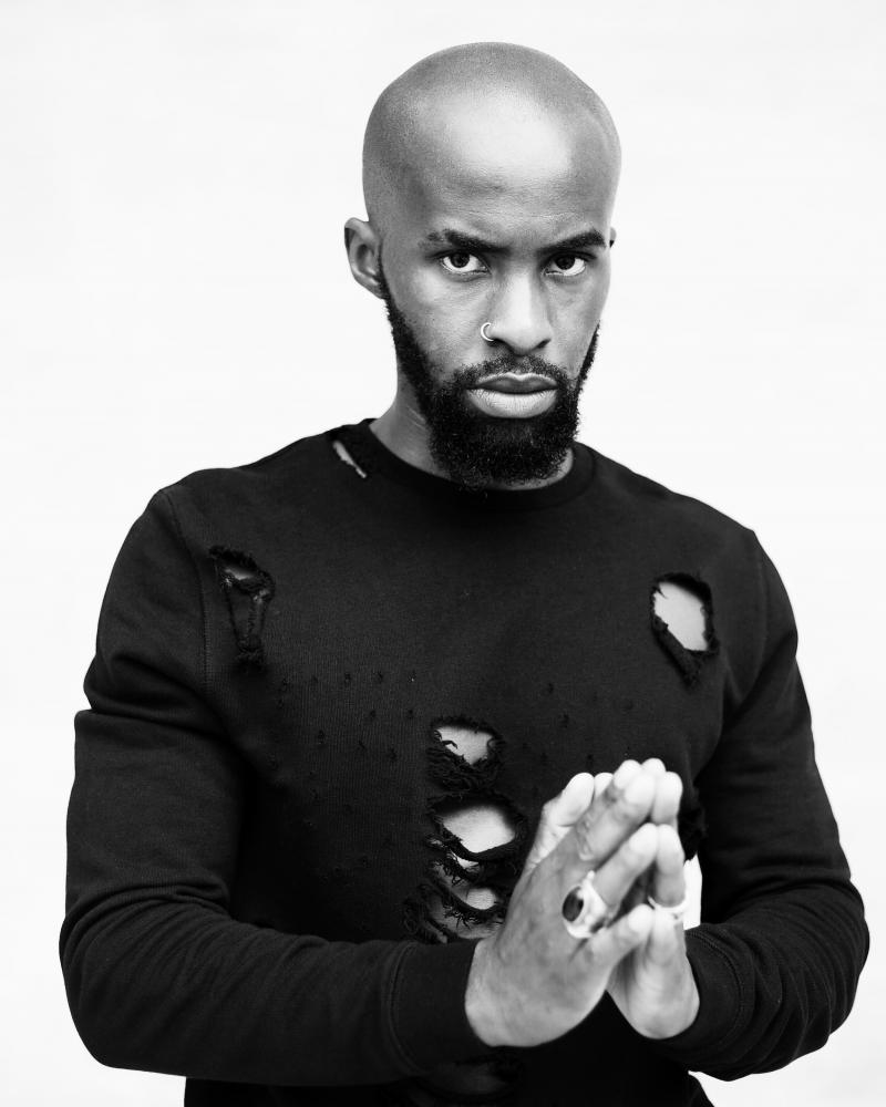 Homme de type afro, regard ténébreux, tatouages discret, silhouette athlètic et svelte, visage aux traits fins, dent du bonheur, crâne rasé et barbe, forte prestance et éloquence, charismatique, egnimatique, bonne rhétorique,