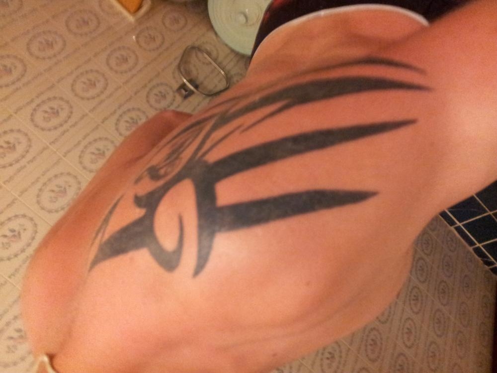 tatouage arrière de l'épaule gauche, tatouage sur les cotes, et tatouage l'avant-bras
