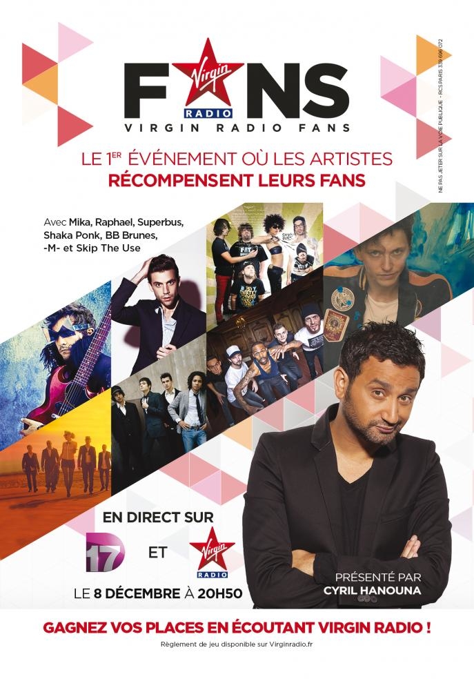 Du 24 octobre au 4 décembre, les fans de BB BRUNES, M, RAPHAEL, SHAKA PONK, SKIP THE USE, SUPERBUS et MIKA s’affrontent sur la page facebook Virgin Radio France. Le candidat Fan qui aura reçu le plus de soutiens recevra, le 8 décembre, le premier « VIRGIN RADIO FANS ».