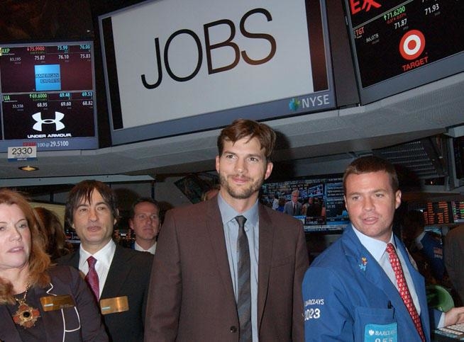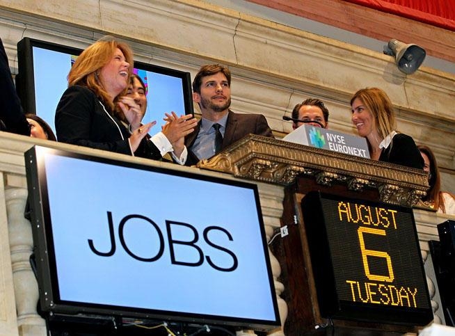 En pleine promotion de "Jobs" qui sortira en france le 21 aout, le biopic sur le créateur de la marque Apple, Ashton Kutcher s’est retrouvé hier à sonner la cloche d’ouverture de la bourse à New York.