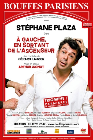 L'immobilier, la télé... et désormais la scène : l'animateur Stéphane Plaza s'essaie à la comédie avec le vaudeville de Gérard Lauzier. Mise en scène par ArthurJugnot, la comédie "A gauche en sortant de l'ascenseur" est présentée au théâtre Les Bouffes Parisiens à Paris jusqu'au 13 juin 2015.