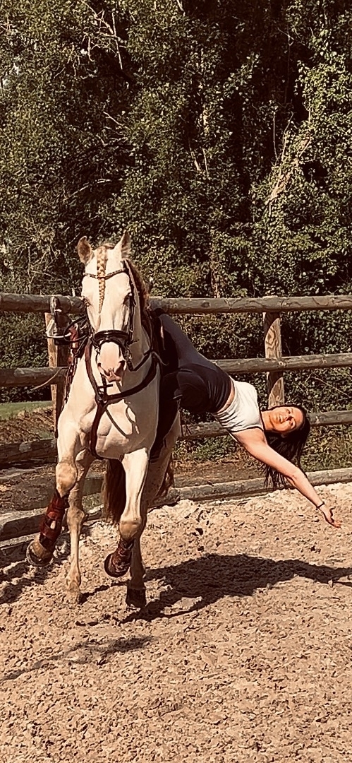 Dresseuse de chevaux, dressage haute école, voltige cosaque et figures acrobatiques acrobatiques à cheval. Expérience en spectacle équestre: création et exécution de chorégraphies à cheval.