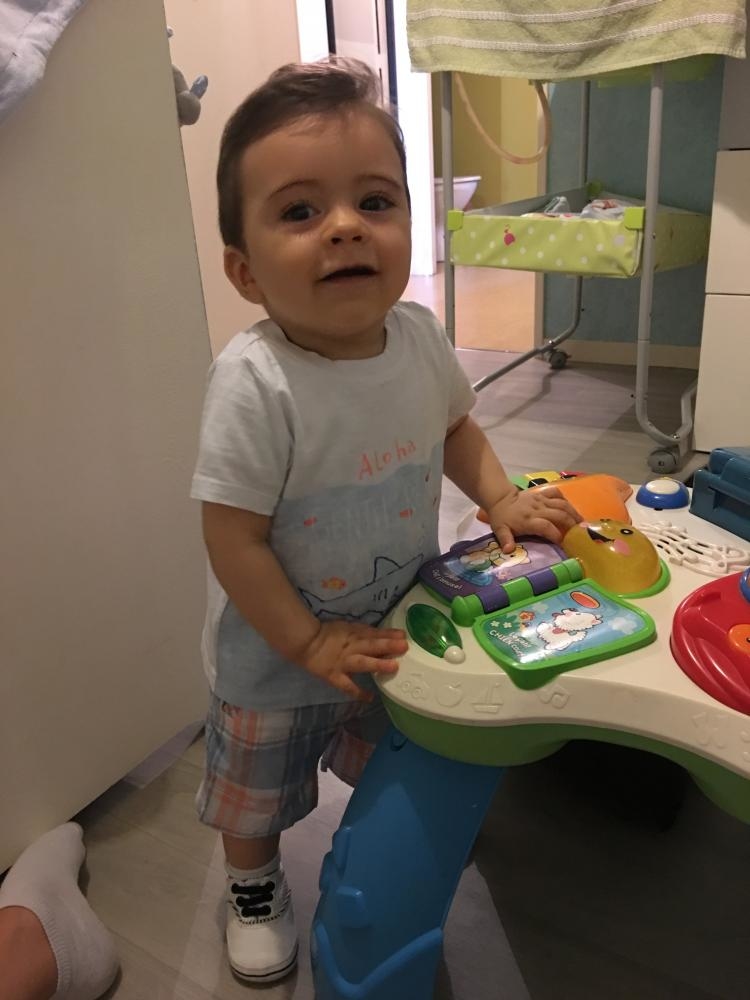 Un regard charmeur accompagné d 'un sourire malicieux, ce bébé est absoluement magnifique.