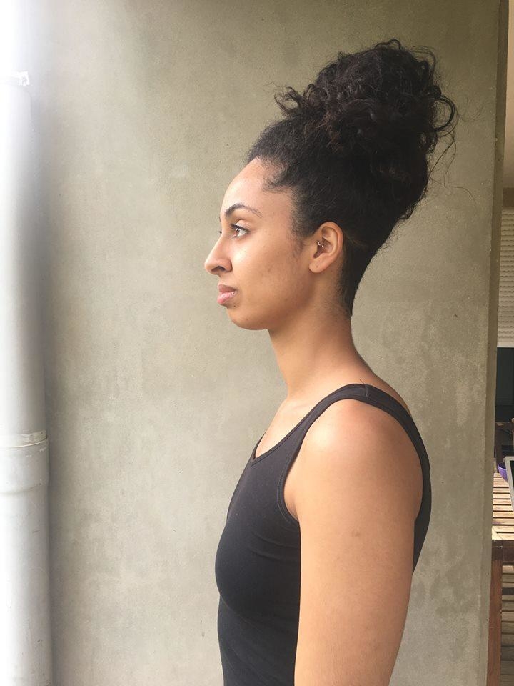 Grande, métisse (Franco-marocaine), athlétique, cheveux type métisses/afro - nuque rasée - piercing oreille