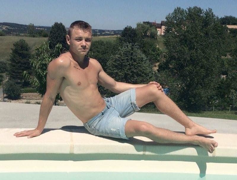 je suis tatoué, sportif, blond aux yeux bleus, jolies dents, muscles apparents